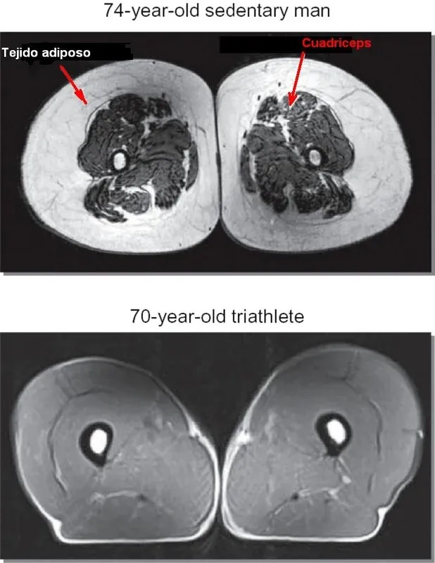 Este es el cuádricpes de un triatleta a los 70 y de un hombre sedentario de la misma edad ¿Ves diferencias?